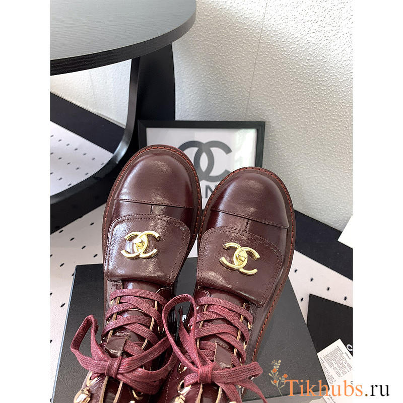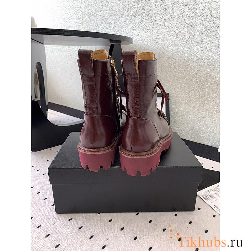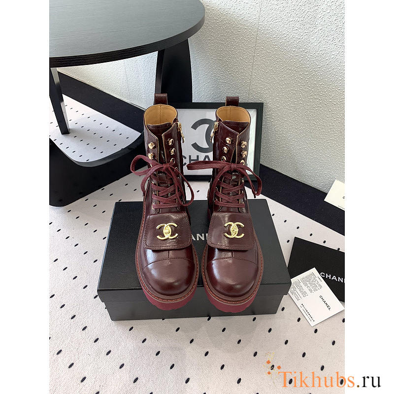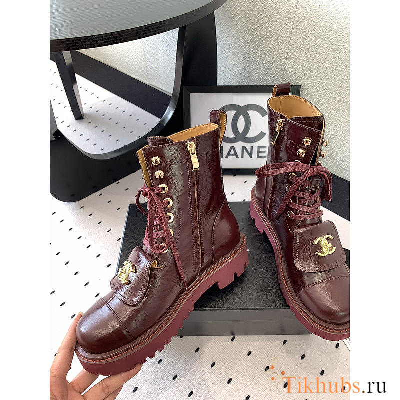 Chanel CC Short Boots Gold Logo Print Lambskin Red Wine