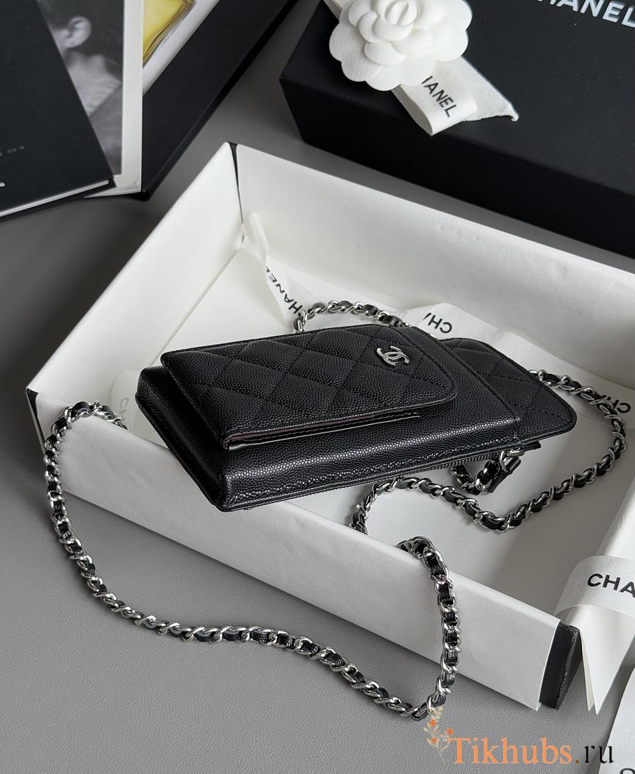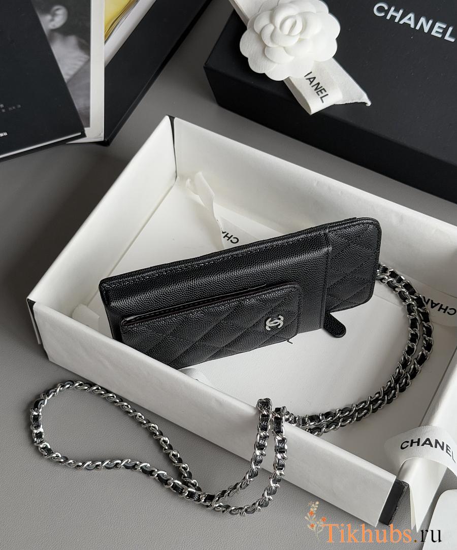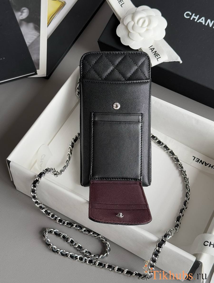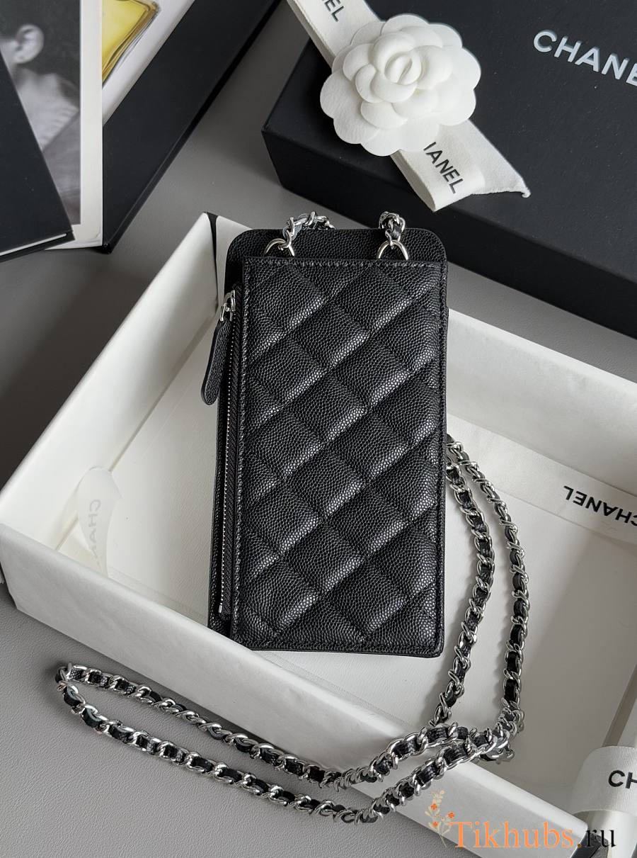 Chanel Phone Holder Crossbody Caviar Silver Black 18x9.5x3cm