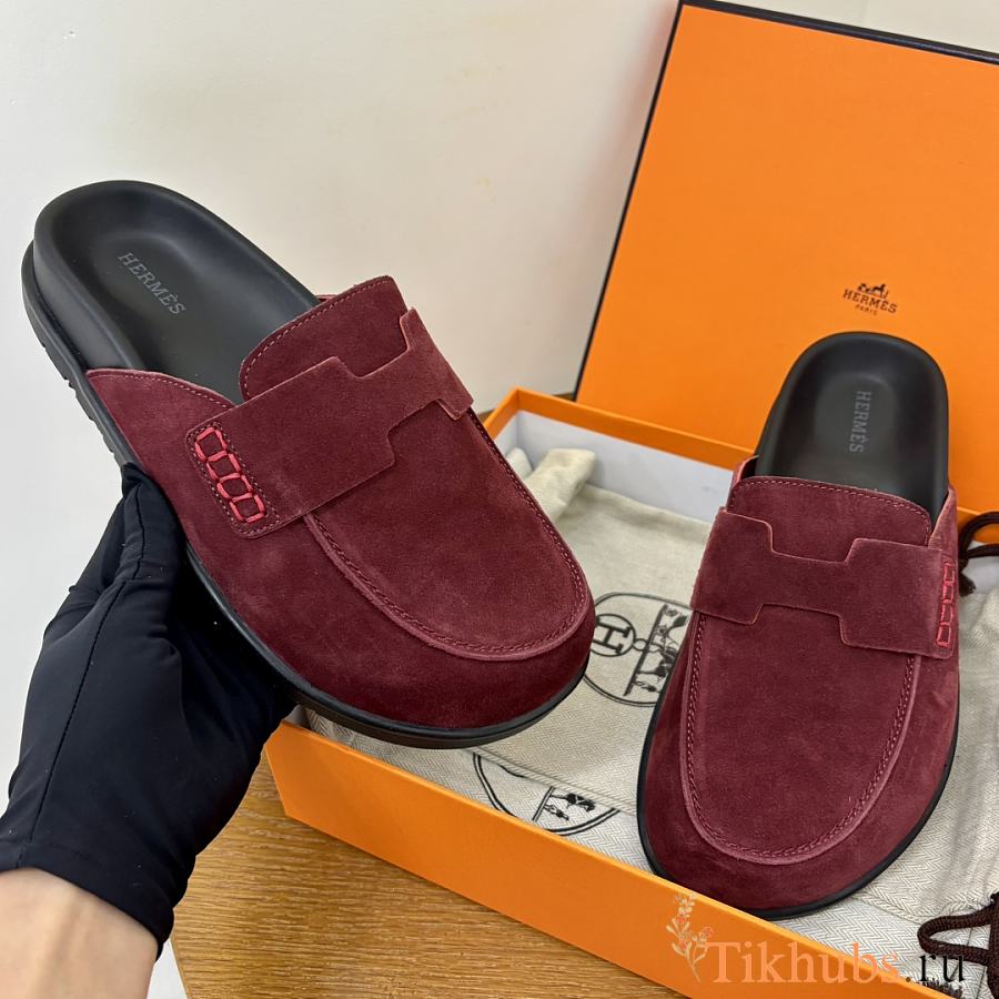 Hermes Red Wine Suede Slides